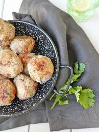 Les divers ingrédients utilisés pour réussir la recette sont : Mélanger 300 g de boeuf + 300 g de porc hachés + 60 g de pain trempé au lait + 1 oeuf + 1/2 oignon et 1 bâton de citronnelle hachés + 20 g de gingembre mariné (celui des sushis). Rouler 20 boulettes dans la farine. Cuire 8 mn de chaque côté.