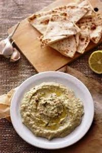 Les divers ingrédients utilisés pour réussir la recette sont : Cuire 40 mn à 180 °C (th. 6) une belle aubergine. Prélever sa chair, la mixer avec 1 gousse d’ail, 10 cl d’huile d’olive et 4 pincées de sel fumé (Terre Exotique).