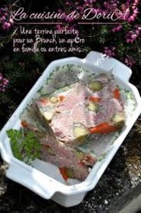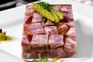 Présentation : Porc cuit longtemps, refroidi en gelée translucide, servi en tranches.