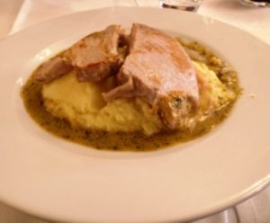Enfin arrive sa tête de veau « Vieille France » sauce ravigote (24€), l’assiette est généreuse, une bonne préparation bien garnie en légumes, la sauce est onctueuse, seul bémol, la viande est légèrement dure, un manque de cuisson.