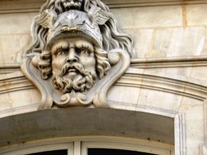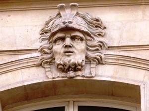 Une tête de guerrier orne le portail du 14 rue de Bourgogne 75007