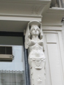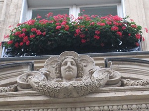 Une tête de femme richement ornée au 1 rue Scribe 75009 et sur la façade des cariatides ailées