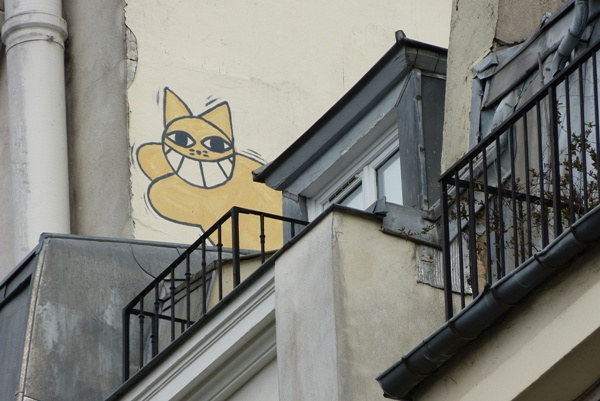 En levant les yeux rue Rambuteau 75001, voici un chat bien souriant