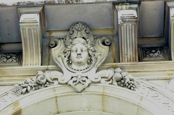 Au 9 rue du Quatre Septembre 75002 une tête de jeune  femme couronnée surmonte sur le portail