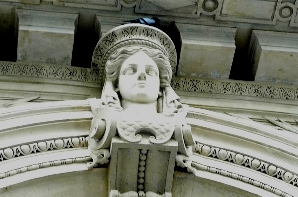 Au 3 rue du Quatre Septembre 75002 une tête de femme couronnée trône sur le portail