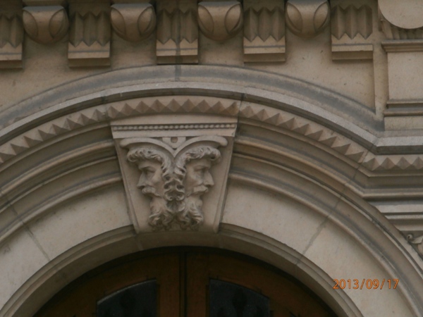Médaillon de deux têtes en vis à vis  au dessus du portail