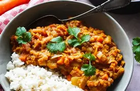 Les divers ingrédients utilisés pour réussir la recette sont : petits poireaux, lentilles corail, gingembre frais, gousses d’ail, graines de coriandre, petit piment rouge, huile neutre, beurre, garam masala, lait de coco, concentré de tomates, riz basmati, gousses de cardamome, clous de girofle…
