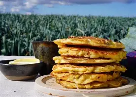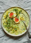 Les divers ingrédients utilisés pour réussir la recette sont : oeufs bio, gros poireau émincé finement, gousses d’ail émincées finement, grosses pommes de terre à chair farineuse épluchées, épis de maïs, bouillon de légumes, smoked water (halen môn), gros bouquet de coriandre, crème fraîche, jus de citron, huile d’olive…