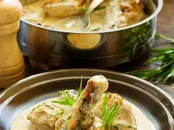 Les divers ingrédients utilisés pour réussir la recette sont : échalotes, blanc de poireau, gousses d’ail, huile, blancs de poulet, eau, vin blanc, cube de bouillon, crème fraîche épaisse, citron jaune bio, sel, poivre, bouquet d’estragon…