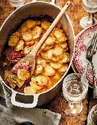 Pour la soupe : pommes de terre farineuses, poireaux, oignons rouges, lard fumé, huile de coco, farine, bouillon de légumes, lait entier, brins de persil, brins de coriandre, moules, palourdes…