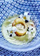 Crème de brocoli et poireaux, noix de Saint-Jacques