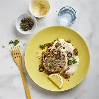 Tartare d’agneau aux olives noires et câpres
