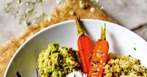 Les divers ingrédients utilisés pour réussir la recette sont : quinoa cuit, carottes, chou rouge, avocat, graines de chanvre, citron, yaourt de coco, huile d’olive…