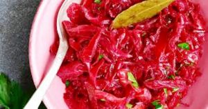 Ingrédients: oignon émincé, chou rouge râpé, betteraves pelées, coupées en lamelles, feuilles de laurier, bouillon de poule, eau, cassonade, vinaigre de vin rouge, concentré de tomates, branches de persil frais haché, sel, poivre…