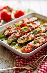 Ingrédients: courgettes moyennes, tomates bien mûres, boules de mozzarella, huile d’olive, feuilles de basilic frais, origan séché, sel, poivre…