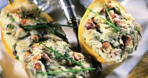 Que ce soit pour accompagner un plat de viande ou de poisson ou même en entrée avec une salade, essayez cette recette automnale qui allie saveurs sucrées et salées ! Les poires sont farcies de bleu d’Auvergne, cognac, crème épaisse et noisettes concassées avant d’être gratinées au four.