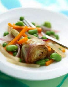 Ingrédients: petits champignons, botte de navets nouveaux, botte de carottes, botte d’asperges vertes, botte d’oignons blancs, pois gourmands, tête de brocolis, mini choux fleurs, fèves, huile d’olive vierge extra, vin blanc, fond de veau, petite boîte de tomates pelées, citron, grains de poivre, graines de coriandre, bouquet garni, sel, poivre…