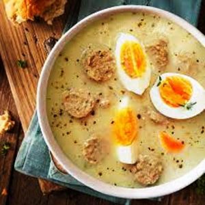 Les mets servis ce jour-là sont : Zurek (Le żurek (prononcer « jourek ») est une soupe aigre d’origine polonaise1, sorte de bortsch blanc à base de farine de seigle fermentée, de cumin, de légumes divers (carottes, persil, céleri), dans laquelle on ajoute à la fin de la cuisson des lardons fumés ou des œufs durs coupés en deux2.), boudin blanc, jambon, œufs et raifort.