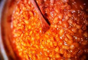 À la fin de la préparation, le bouillon d’awara est de couleur orangé à marron clair. Il est accompagné le plus souvent de riz blanc.