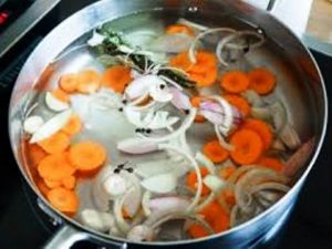 Le court-bouillon est un liquide servant aux cuissons brèves, par pochage, de certains poissons, crustacés, cervelles ou légumes, composé d’eau salée et poivrée mouillée de vin blanc et de vinaigre, de carottes et d’oignons émincés et d’un bouquet garni.
