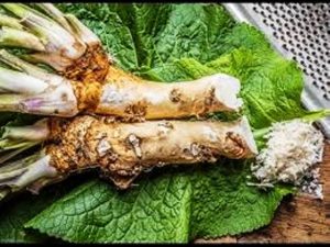 Le raifort, un condiment fort et piquant porte différents noms tels que grand raifort, moutarde des allemands, cran des anglais, radis de cheval ou encore raifort sauvage. Il pousse très facilement au jardin mais attention, il a tendance à être un peu envahissant. Par ailleurs ses racines pivotantes charnues épuisent le sol : mieux vaut attendre plusieurs années avant d’en replanter au même endroit.