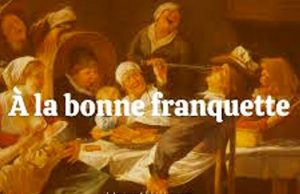 Cette forme modelée à partir de l’adjectif « franc » et donnée pour régionale (de Picardie ou de Normandie), aurait d’abord été connue au XVIIe siècle dans l’expression « à la franquette » au sens de franchement, avant de devenir, au XVIIIe siècle « à la bonne franquette » qui prend le sens, encore actuel, de « sans faire de façons », « avec simplicité ». Étrangement, Rat, dans les années 1950, observait que « à la bonne flanquette remplace de plus en plus franquette », laquelle, il faut croire, a depuis lors contre-attaqué et évincé l’usurpatrice « flanquette ». Tout comme « à la fortune du pot » déjà rencontrée plus haut, la locution, répétée plusieurs fois à la forme exclamative, constitue une façon de mettre à l’aise celui qu’on invite à l’improviste à partager son repas.