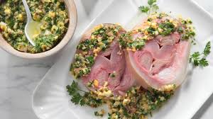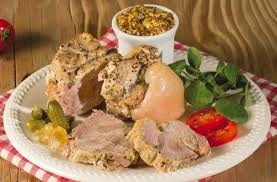 Le jambonneau se déguste froid en tranche un peu épaisse en entrée sur une petite salade accompagnée d’oignons rouges et de cornichons.