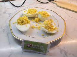 Apicius donne des œufs farcis (les jaunes sont aromatisés à la marjolaine, au safran, clous de girofle broyés, fromage), les œufs reconstitués, passés au gril sont servis au vinaigre.