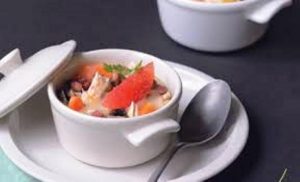 Les divers ingrédients utilisés pour réussir la recette sont : blancs de poulet, pamplemousses roses, champignons de paris, lardons, beurre, farine de blé, cube de bouillon de volaille, coriandre fraîche, jaune d’œuf, crème fraîche épaisse, sel, poivre, eau…