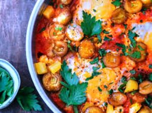 Les divers ingrédients utilisés pour réussir la recette sont : tomates en conserve, mirabelles de Lorraine fraîches ou surgelées, pois chiches cuits, œufs, oignon jaune, gousse d’ail, poivron jaune, origan, sauce barbecue, feuilles de persil, sel, poivre…