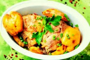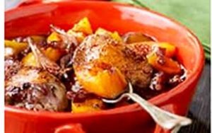 Le traditionnel coq au vin s’agrémente de nectarines jaunes, pour un jeu de saveur surprenant.