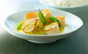 Dans cette recette originale, la Saint-Jacques est flanquée de morceaux de pomme verte et est parfumée d’une pointe de curry. À déguster avec du riz basmati.