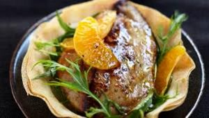 Les divers ingrédients utilisés pour réussir la recette sont : feuilles de brick, clémentines, foie gras de canard cru, miel, banyuls, fond de volaille, mesclun…