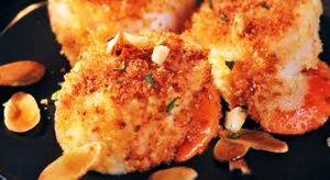 On craque pour cette recette de noix de Saint-Jacques enrobées d’une fine couche de chapelure à la poudre d’amandes.