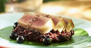 Les divers ingrédients utilisés pour réussir la recette sont : vin rouge, myrtille, pavés de thon, riz rond complet, jus de myrtille, jus de betterave, jus d’orange, sucre complet, clous de girofle, étoile d’anis étoilé, bâton de cannelle, huile de noix torréfiée, sel, poivre…