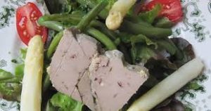 Les divers ingrédients utilisés pour réussir la recette sont : haricots verts frais, pointes d’asperges fraîches, feuille de chêne rousse, tomates cerises, foie gras mi-cuit, échalote, gousse d’ail, huile d’olive, vinaigre de xérès, sel, poivre, persil, cerfeuil, estragon …
