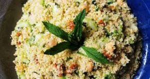 Les divers ingrédients utilisés pour réussir la recette sont : couscous moyen (pas de semoule), pois chiches, tomates confites, concombre, huile d’olive, cumin, citrons, sel, poivre, oignon, menthe, persil, coriandre…