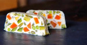 Un nougat glacé est composé d’un mélange de meringue italienne et de crème montée, auquel on ajoute du miel et un mélange de fruits secs.