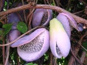 Magnifique liane grimpante à la floraison en grappes violet clair très odorante. Les fleurs femelles sont positionnées à la base et mâles, plus petites et plus foncées, en extrémité de la grappe. Produit de gros fruits blanc-crème.