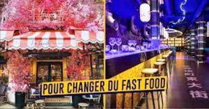 Chaque table est entourée de murs d’images animées qui décorent de petites assiettes d’inspiration perplexe telles que des cigarettes au foie gras et des gâteaux de lune cuits avec des ingrédients traditionnels français.