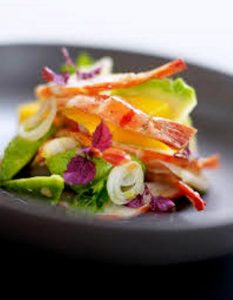 Les divers ingrédients utilisés pour réussir la recette sont : mangues vertes, crabe royal, tomates cerise, échalote, piments rouges, huile de tournesol…
