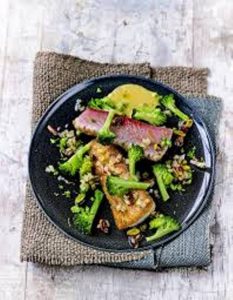 Les divers ingrédients utilisés pour réussir la recette sont : bonite sans peau, huile d’olive, oignon doux, gousse d’ail, pistaches non salées, brocoli, citron jaune, jaunes d’oeufs, crème liquide, beurre, pâte de pistache…