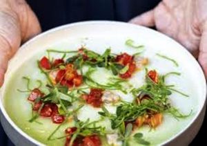 Les divers ingrédients utilisés pour réussir la recette sont : concombre, coques, grosse tomate avec peu de pépins, feuilles d’oseille, origan frais, pourpier sauvage, cornichon malossol, huile de pépins de raisin, vinaigre de cidre, feuilles de gélatine…