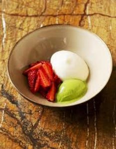 Pour terminer sur une note fraîche et fondante, rien de mieux qu’un dessert à base de fraises, glace aux herbes, mousse au chocolat blanc, dans lequel la touche herbacée de la crème glacée révèlera tout son potentiel aromatique. Hors saison, on utilise évidemment des fruits surgelés, ou d’une autre variété.