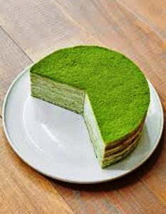Pour les crêpes : poudre de thé matcha, lait, oeufs, jaunes d’oeufs, farine, sucre glace, beurre fondu…