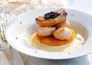 Les divers ingrédients utilisés pour réussir la recette sont : noix de Saint-Jacques, escalopes de foie gras frais, brisures de truffe, fond de veau, beurre doux, fleur de sel, huile d’olive, vinaigre de Barolo…