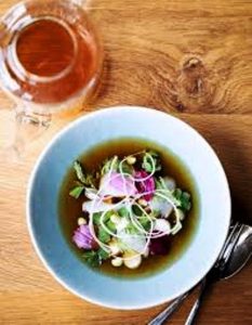 Ce hors-d’œuvre sera à l’honneur, un poisson fin et luxueux, magnifiquement mis en valeur grâce à un bouillon intense. Ce plat, inspiré de la fondue japonaise (le shabu-shabu), est aussi excellent avec des noix de Saint-Jacques.