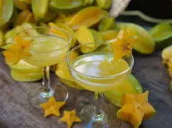 Pour préparer le jus de carambole, il suffit de quelques fruits coupées en tranches pour enlever les graines et les parties dures près des bords (aux pointes des étoiles). Les tranches sont mixées avec un peu d’eau pour faciliter l’extraction du jus. Le mélange est ensuite filtré pour enlever les résidus solides et obtenir un jus clair.