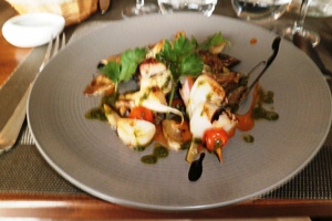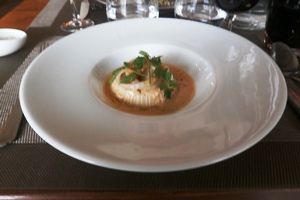 Au bout d’un court moment, la serveuse m’apporte mon entrée: une royale de homard tiède aux blancs de seiches, pousses d’herbes folles, c’est bien présenté et fort gouteux, d’excellentes saveurs, cependant c’est trop tiède.