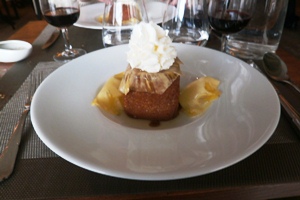 Pour le dessert, j’ai choisi un baba cubique, ananas et crème fouettée, un vrai délice, l’ananas est présenté en fines tranches translucides, au dernier moment le chef arrose le gâteau de rhum Saint James, un vrai plaisir gustatif.